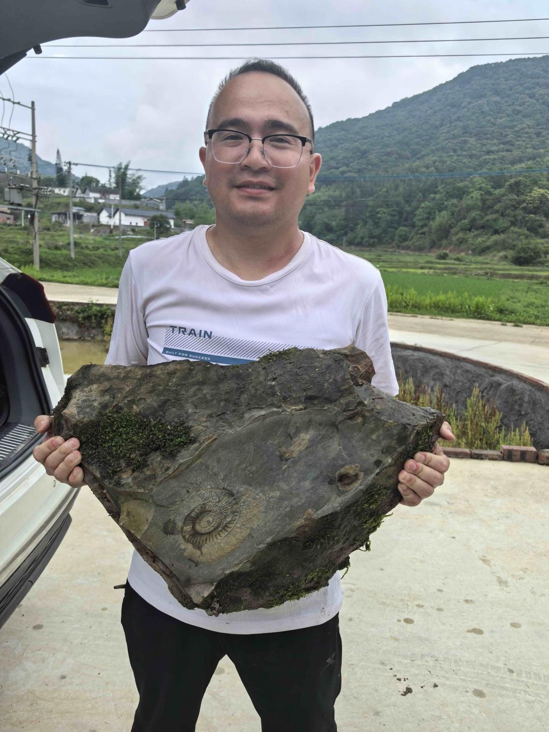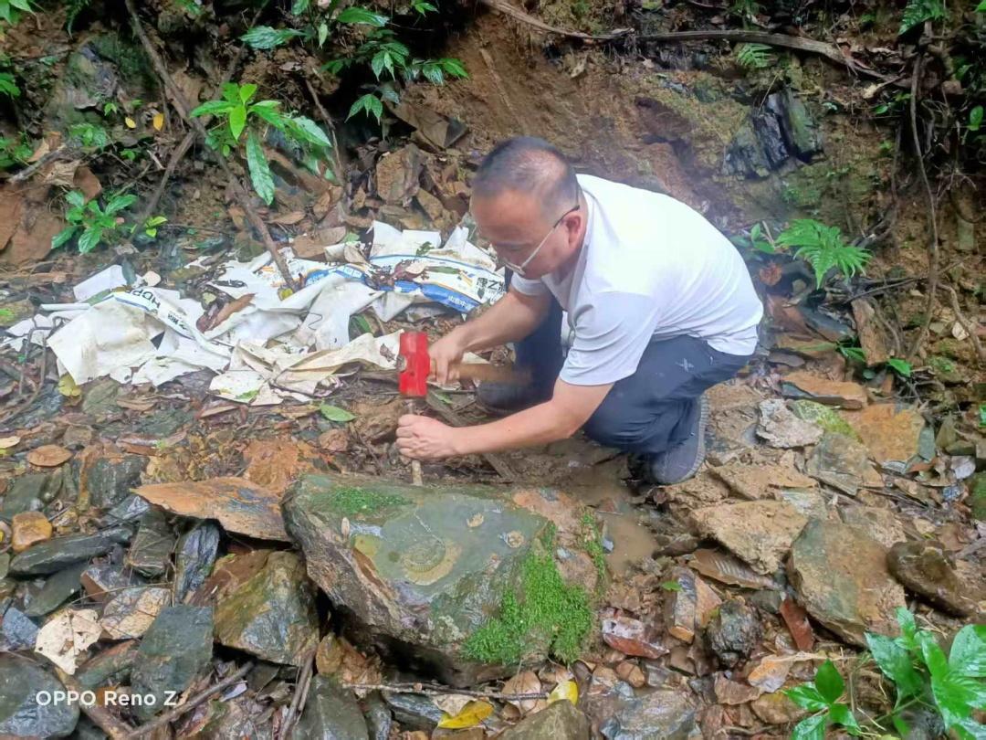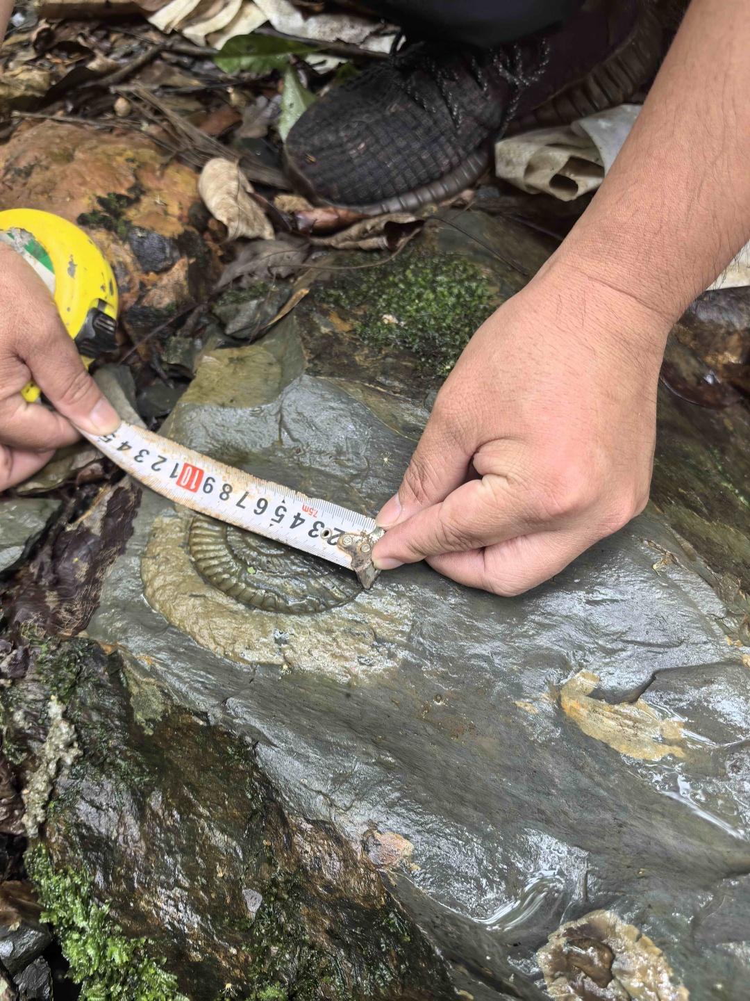 在发现菊石化石后,赖达威当天因巡山时未携带搬运工具,便迅速返回增坑村委会,向当地村干部详细汇报了这一重要发现。当地村干部高度重视,立刻安排部署相关保护工作,近日(5月7日午后12时)由村委会副书记赖伟强与村委会副主任赖达威一同驱车前往化石发现地。经过仔细查看并在现场采取妥善保护措施后,当天下午15时,3人冒雨成功将这块完整的菊石化石搬运回增坑村委会。