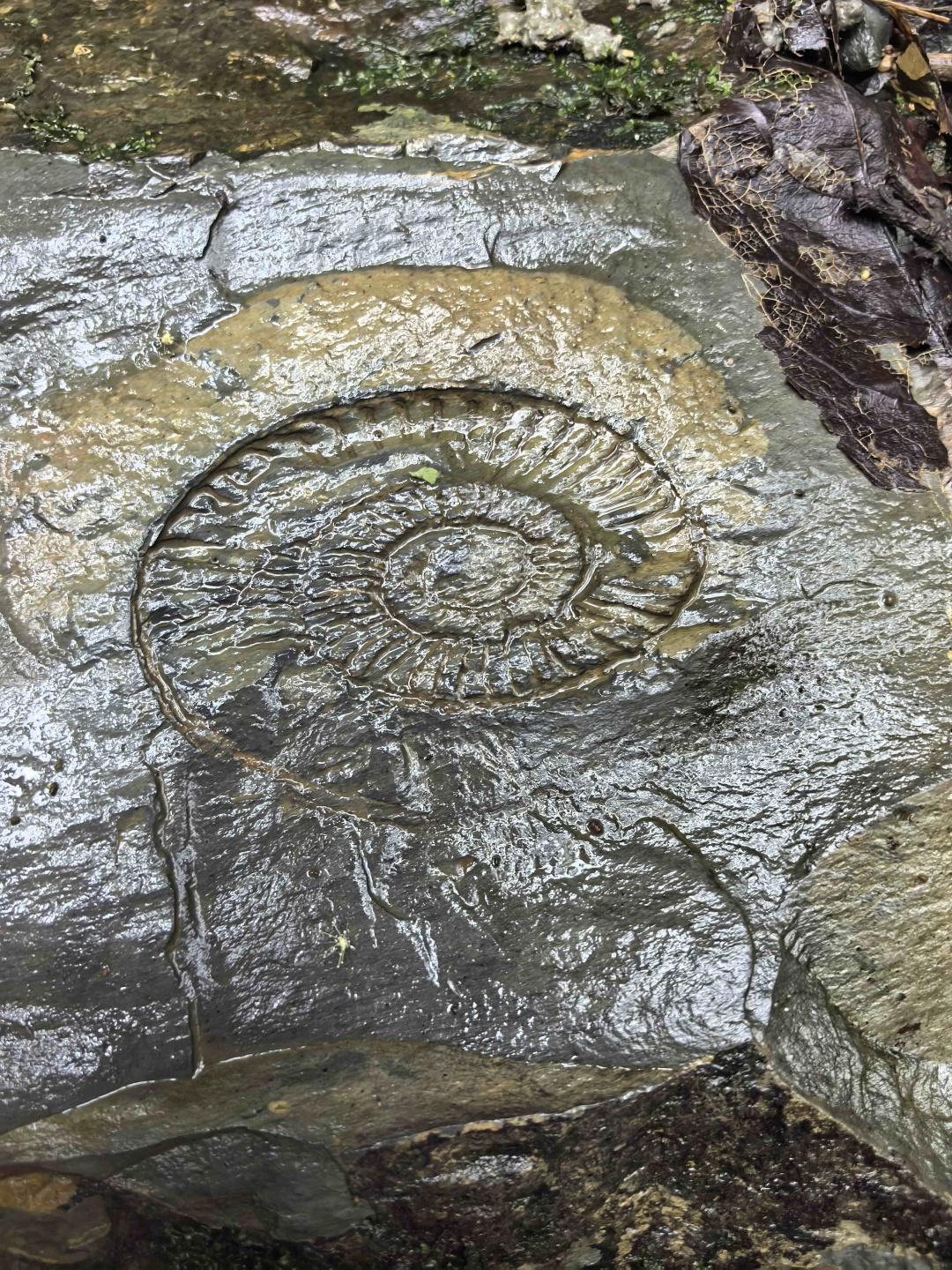河源市东源县双江镇增坑村今日传来一条令人振奋的消息:该村90后大学生村官赖达威在日常巡山时,当其行至万绿湖畔的增坑村珠坑片区夜珠牙(地名)古氏宗祠约1公里处的山间小道旁,意外惊喜地发现了一枚嵌在黑色大石块的完整的菊石化石,其直径长约10厘米。河源恐龙研究所有关工作人员称,河源之前发现的菊石化石多数嵌在松脆酥软的石块里,而这枚菊石化石却嵌在坚硬的石块中,其种属和地层年代还有待今后作出进一步的科学分析与研究。