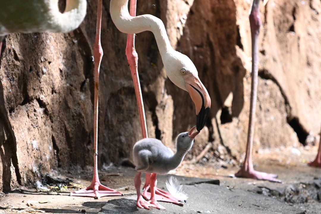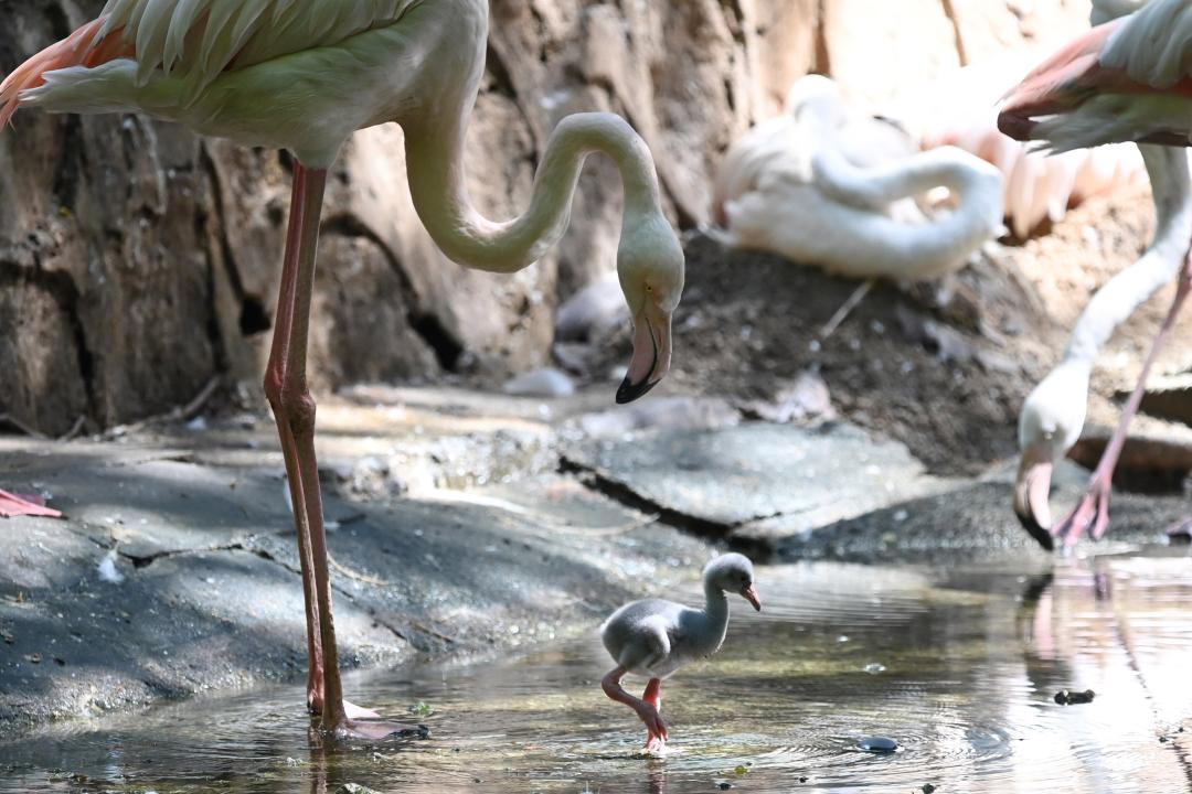 据了解,这只小火烈鸟为自然孵化出壳,目前在其“父母”的悉心照料下茁壮成长。在火烈鸟园看到,小火烈鸟一身灰白色的茸毛,嫩红的小脚,精神抖擞,常常张开小翅膀走动,显得格外可爱。