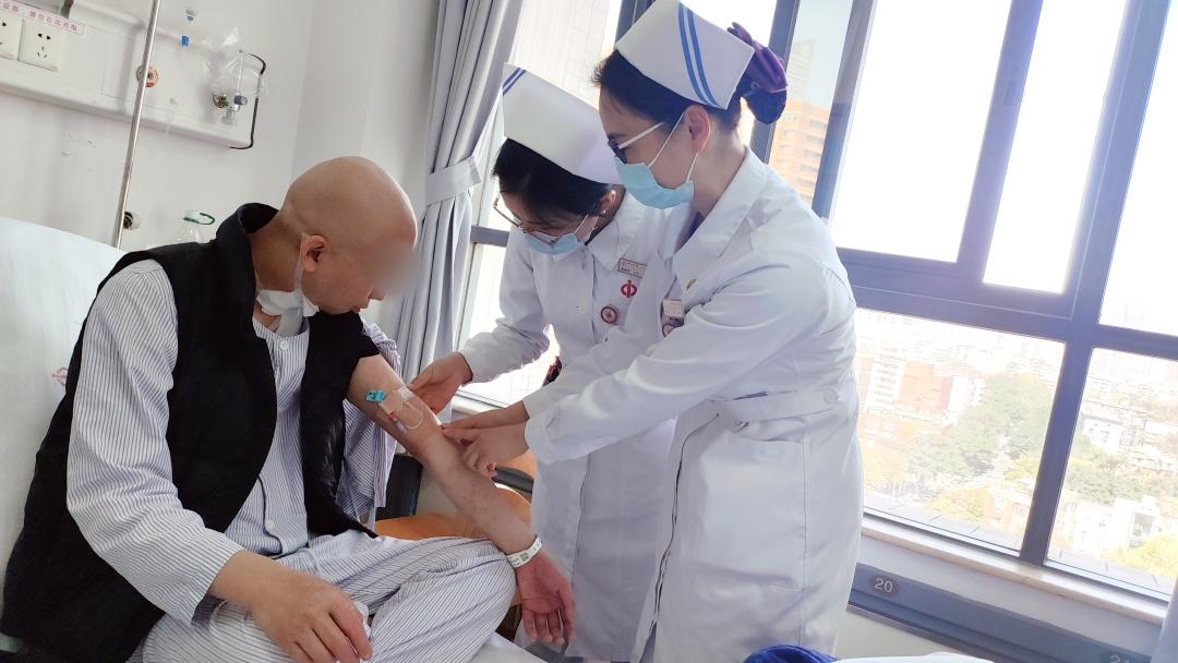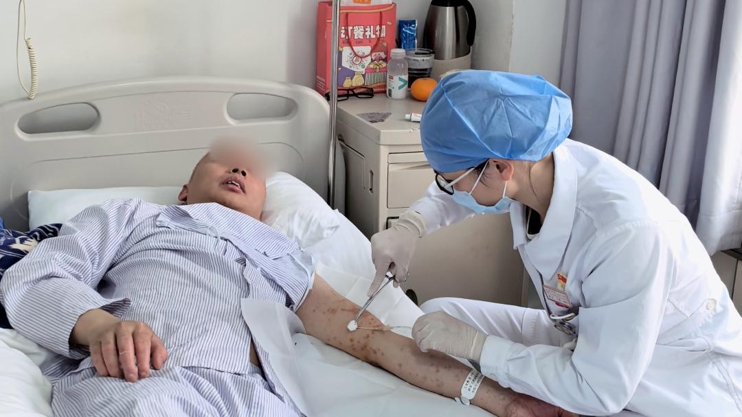 黄先生在接受化疗后,全身多发点状银屑病斑块和红肿脱屑,一度令他痛苦不堪。因为多疗程的化疗和后期手术需要,他早早地留置了PICC,这条重要的通道既能长期输液,又能让刺激性化疗药物直接输送到血液流速快、管径粗的上腔静脉,从而减少反复穿刺的痛苦,降低药物对血管壁的化学刺激,避免外渗风险,提高给药的安全性。然而,皮肤的银屑病斑块很快蔓延到了PICC穿刺口以及穿刺口周围的皮肤,导致皮肤屏障功能丧失,血管导管相关感染风险大大增加……面对患者复杂的病情,中山一院口腔颌面外科李云主管护理师及其护理团队改变常规思路,悉心护好PICC这条“生命通道”。很快,穿刺口周围红肿消退,皮肤新生,再次为他筑起了防护屏障,让他更有勇气走好抗癌之路。这支护理团队用专业证明了她们护理的不只是导管,更是导管另一端鲜活的人生。