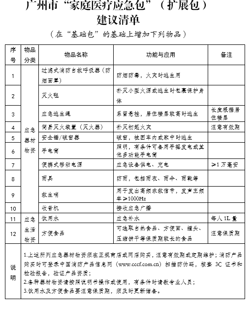 “家庭医疗应急包”拓展包还包括了逃生面罩、灭火器、灭火毯、求生哨子等。广州市天河区棠德消防救援站消防员雷双喜表示,由于家用火灾不少为电气火灾,因此在家庭医疗应急包中推荐干粉灭火器。购买灭火器、逃生面罩等应认准3C认证,购买回家后要定期检查灭火器压力是否充足、逃生面罩的密封性是否良好,超过使用年限就要及时更换。