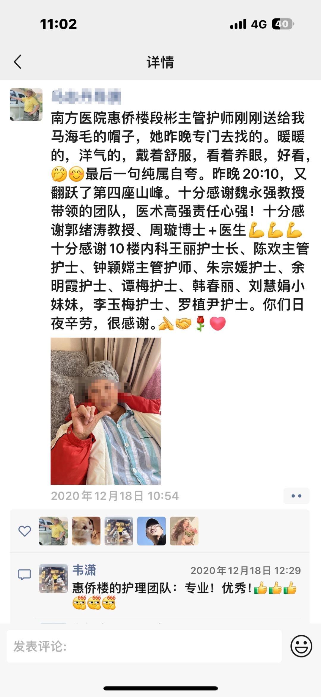 化疗住院期间,马女士戴着段彬送的帽子,愉快地发了个朋友圈。