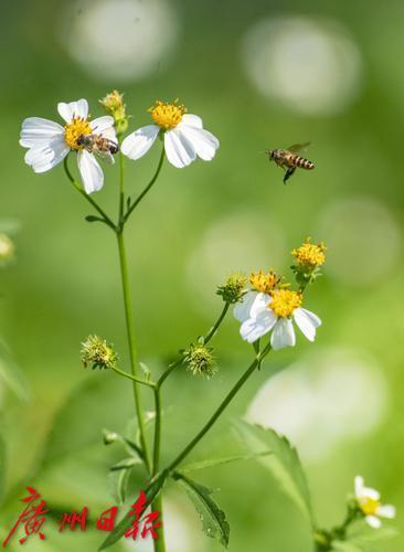 5月12日,广州天气晴朗,阳光一扫前段时间雷雨天气带来的潮气。珠江边的绿地上,盛开的野花招蜂引蝶,形成一幅幅生机勃勃的画面。