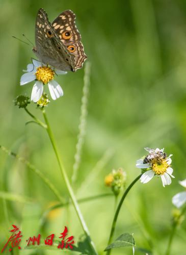 阳光下的绿地中,蜜蜂和蝴蝶“同框”采蜜。