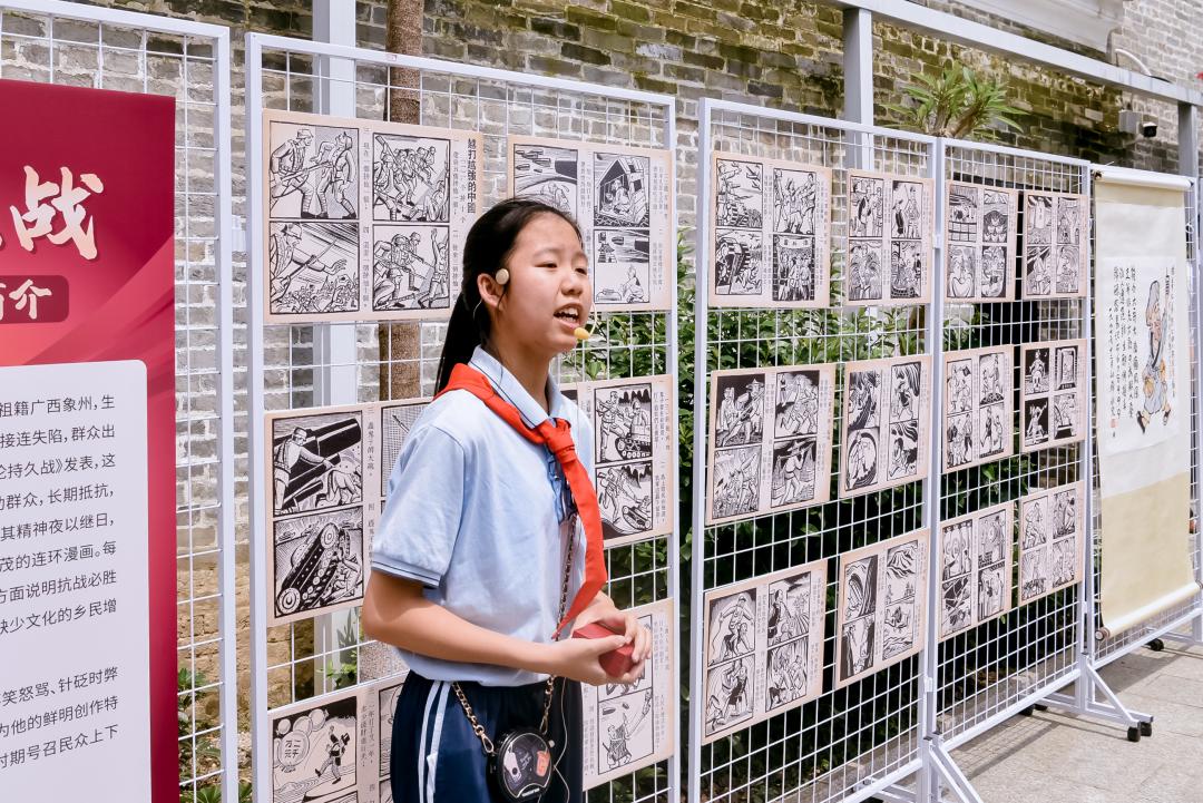 当天,何香凝纪念学校红荔学堂讲解员队伍宣告成立,小讲解员们带领嘉宾参观英雄花开英雄城红色主题画展。作为画展核心亮点,廖冰兄之女、廖冰兄人文专项基金会会长廖陵儿现场捐赠廖冰兄红色画集,并深情回忆父亲以笔为剑、以画为枪的创作历程。“父亲说,漫画不是搞笑,是一种责任。”她表示:“这些作品不仅是历史的见证,更是精神的火种,希望通过展览让更多人铭记‘团结抗战、共赴国难’的民族气节。”