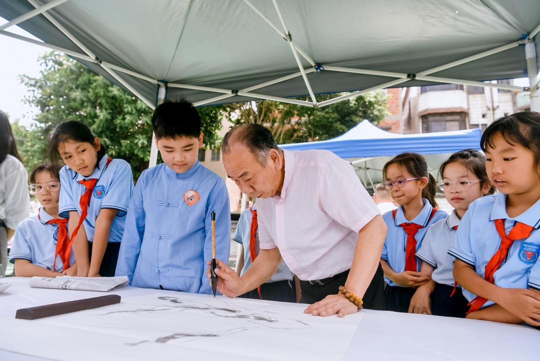 在“共绘荔湾新姿彩”环节,出席活动的嘉宾、艺术家与师生代表携手,在长卷上即兴创作。画中融入了荔枝湾、沙面岛、陈家祠、白鹅潭大湾区艺术中心、永庆坊等元素,生动描绘出荔湾的独特魅力。同时,艺术家们即席挥毫,为活动增添了浓厚的艺术氛围。