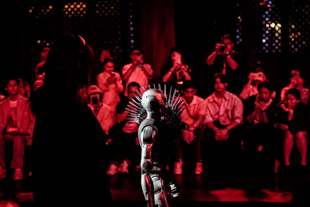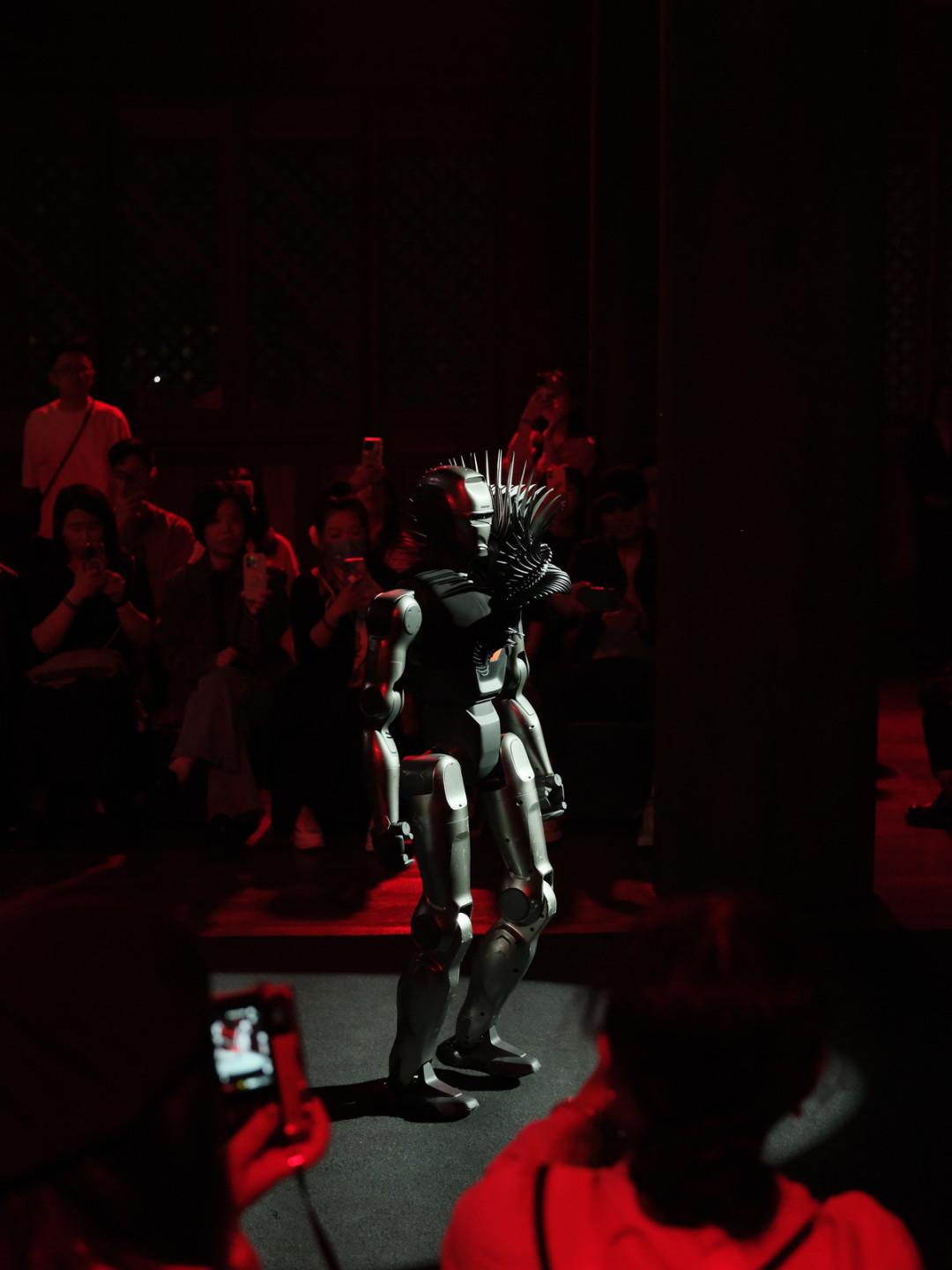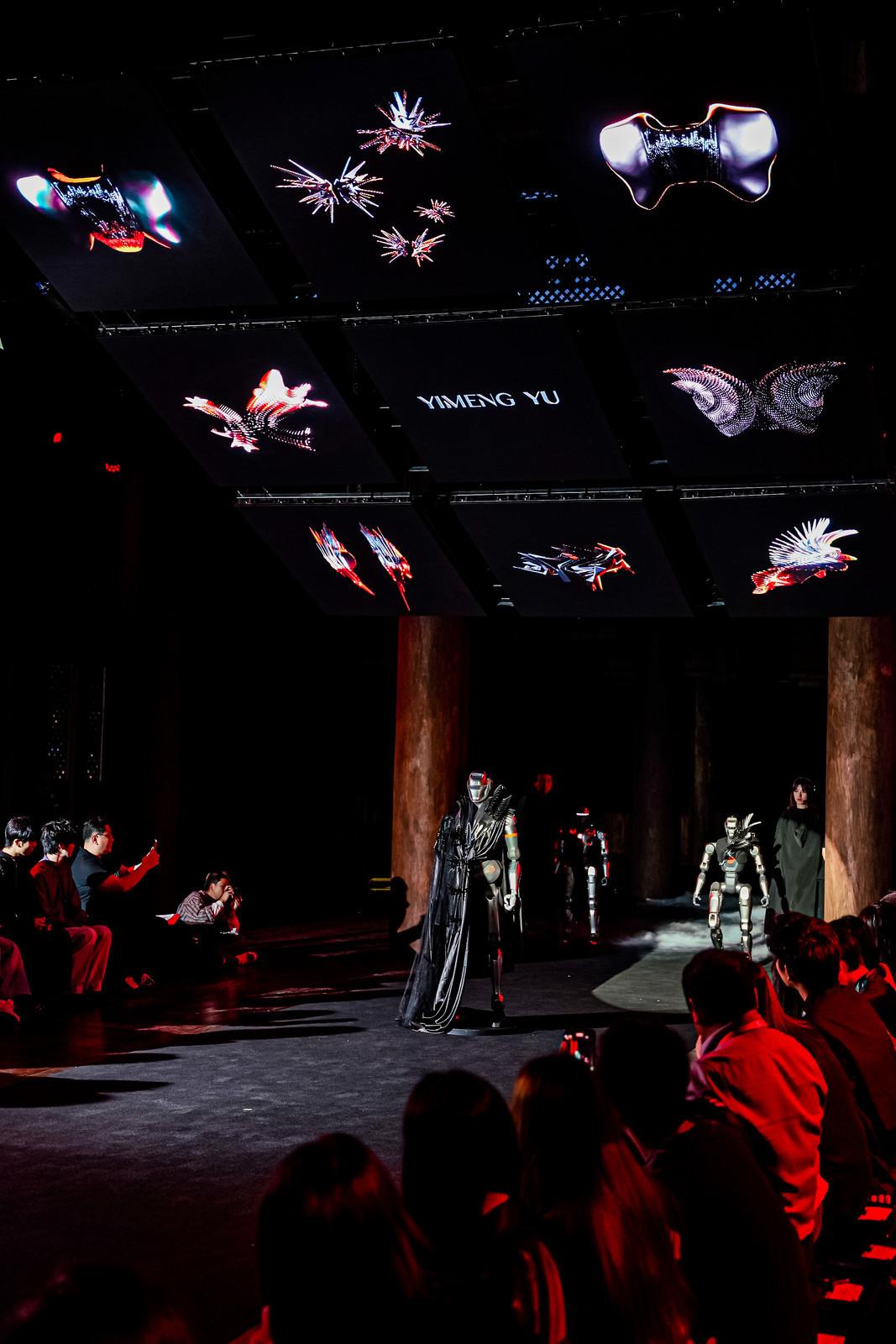 在古典中式建筑水上禅堂中完成整场大秀,在余一萌看来,这场秀发生的场域就是加分项。以3台人形机器人为走秀模特,融合数字孪生模块化3D打印时装系统、生成式AI影像背景、东方山海经音乐和中国红视觉氛围。“将科技感拉满的人形机器人和天马行空的超现实AI数字影像,置于传统文化底蕴深厚的场景和建筑之中,让这个秀的冲击感更强,而且能够映照‘过去与未来’‘传统文化与当代科技’之间的碰撞。”余一萌说。