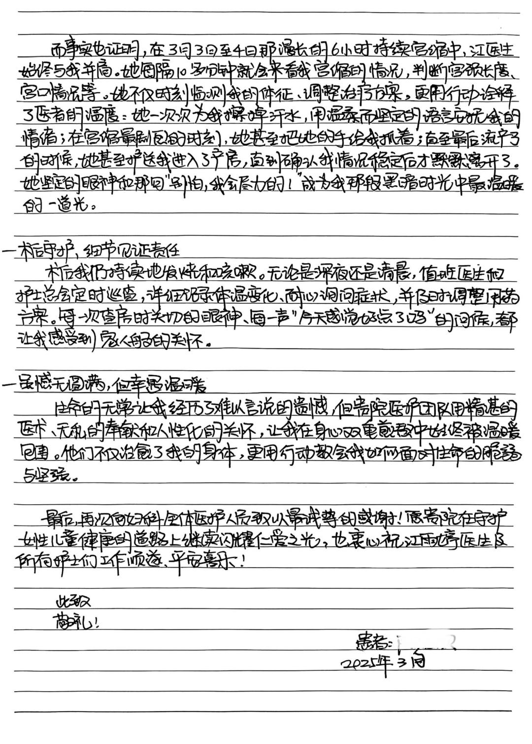 今年1月~3月,孕妇陈女士先后因为大出血和突发宫缩进入广州医科大学附属妇女儿童医疗中心增城院区治疗。尽管最终未能留住腹中宝宝,但两次住院期间医护团队的专业与温情,让她在康复后提笔手写下两页密密麻麻的感谢信。信中写道:“你们给与的关怀和照顾,让我在最脆弱无助的时刻感受到莫大的安慰与力量”。感谢信中特别提到了一位“可爱的男护士”,他“笨拙却真诚的关心”让陈女士印象深刻。