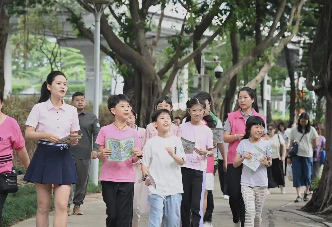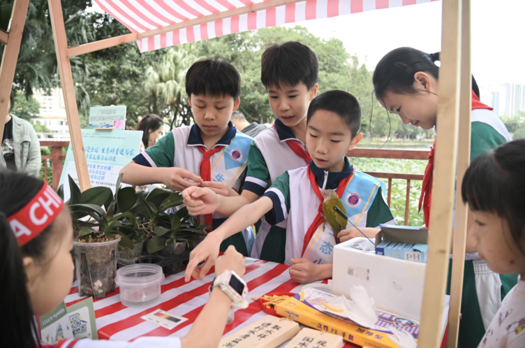 参与者手持地图,根据指引探访生物多样性探索、水资源保护、绿美家风传承、绿色生产体验、环境安全教育、绿美家风传承、小河长体验等6大主题打卡站点。健康行路线上还设置了VR体验站点拓宽孩子的生态认知,家校社协同展区则展示了“西关美食IP打造”的实践过程。亲子家庭或在动植物识别、水质小实验中提升生态认知,或在跳绳念“环保家规”、复种兰花、垃圾分类等体验中践行绿色理念,实现生态理念与运动成果“双丰收”。