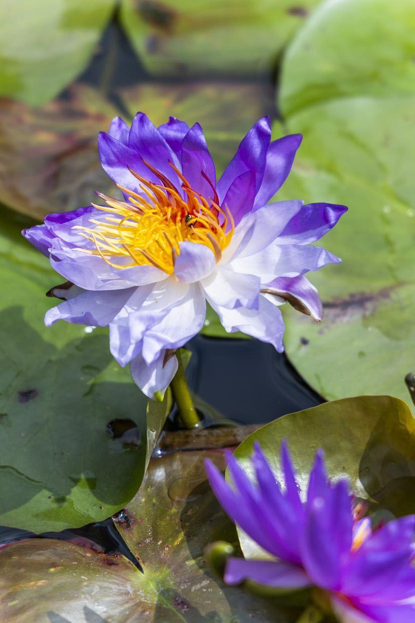 此次发现的双色睡莲,品种名为“咏叹调”。该朵双色莲花瓣色泽优雅,一半呈淡蓝色,另一半则呈现出深邃神秘的紫罗兰色调;花心颜色也别具一格,以黄色与绚丽的橙红色并存。整朵花宛如一幅天然晕染的水彩画。