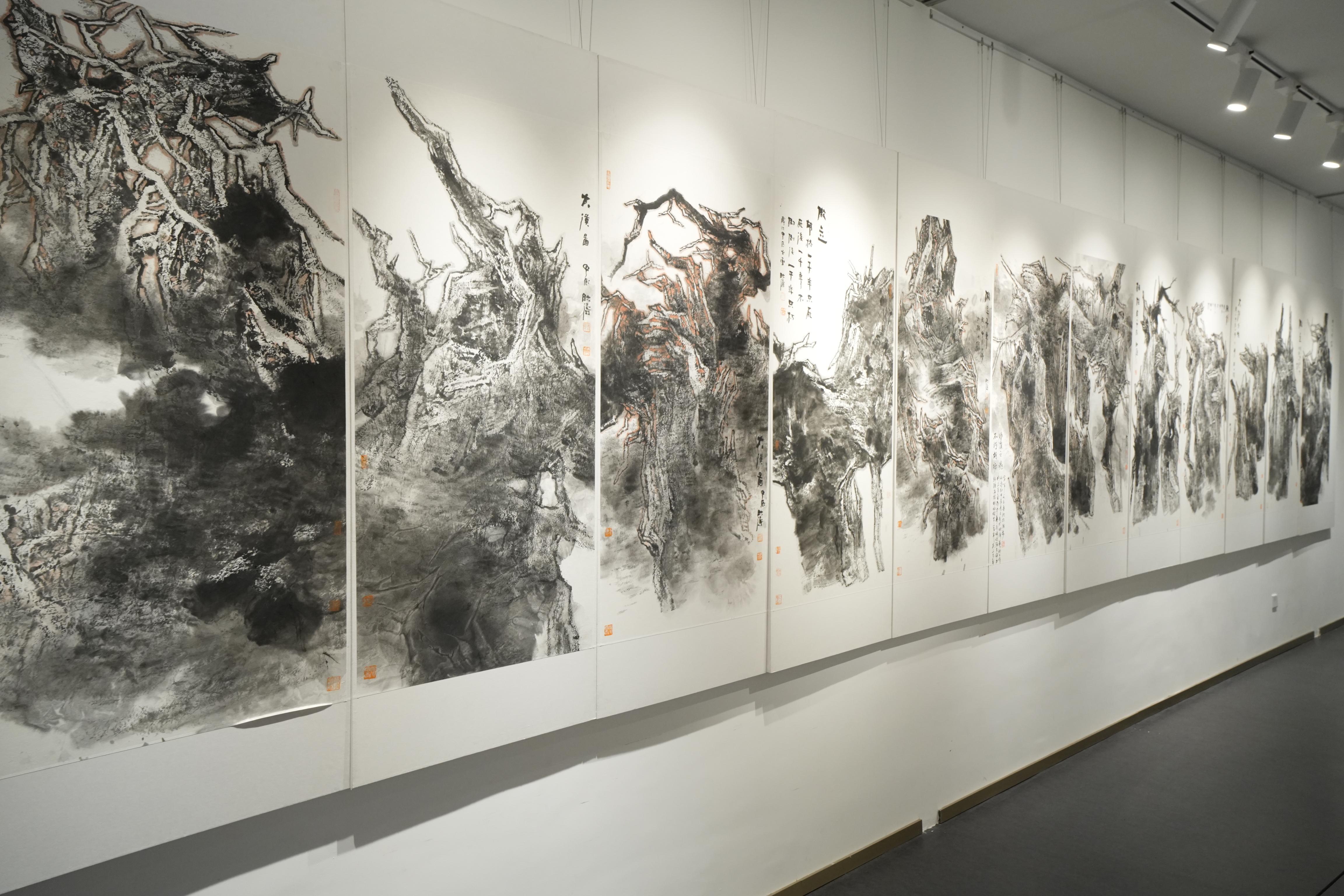 林映涛表示,“胡杨树”系列的创作灵感来源于胡杨树在极端环境下的顽强生存和对环境的适应能力。胡杨树,被誉为“沙漠的保护神”,是沙漠生态系统中的关键组成部分,与生态保护之间存在着密不可分的联系。此外,胡杨能够在干旱、缺水的条件下生存,甚至能在地下扎根50多米以寻找水源。这种顽强的生命力使得胡杨成为了坚韧不拔的象征。它们在沙漠中屹立千年,记录着地球的自然演变和人类文明的发展。“在创作中,我试图通过强烈的动态和有力的笔触,展现胡杨树的生命力和对环境的挑战。传统山水画的笔墨语言并不太完全适合用来表现胡杨树,我尝试从版画创作的基底来进行材料转换和语言迁移,用线条勾勒加皴擦作为基本造型语言,渗入中国画的章法和水墨韵味。”
