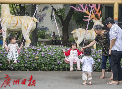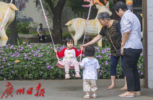广州文化公园,家长带着小朋友在玩秋千。
