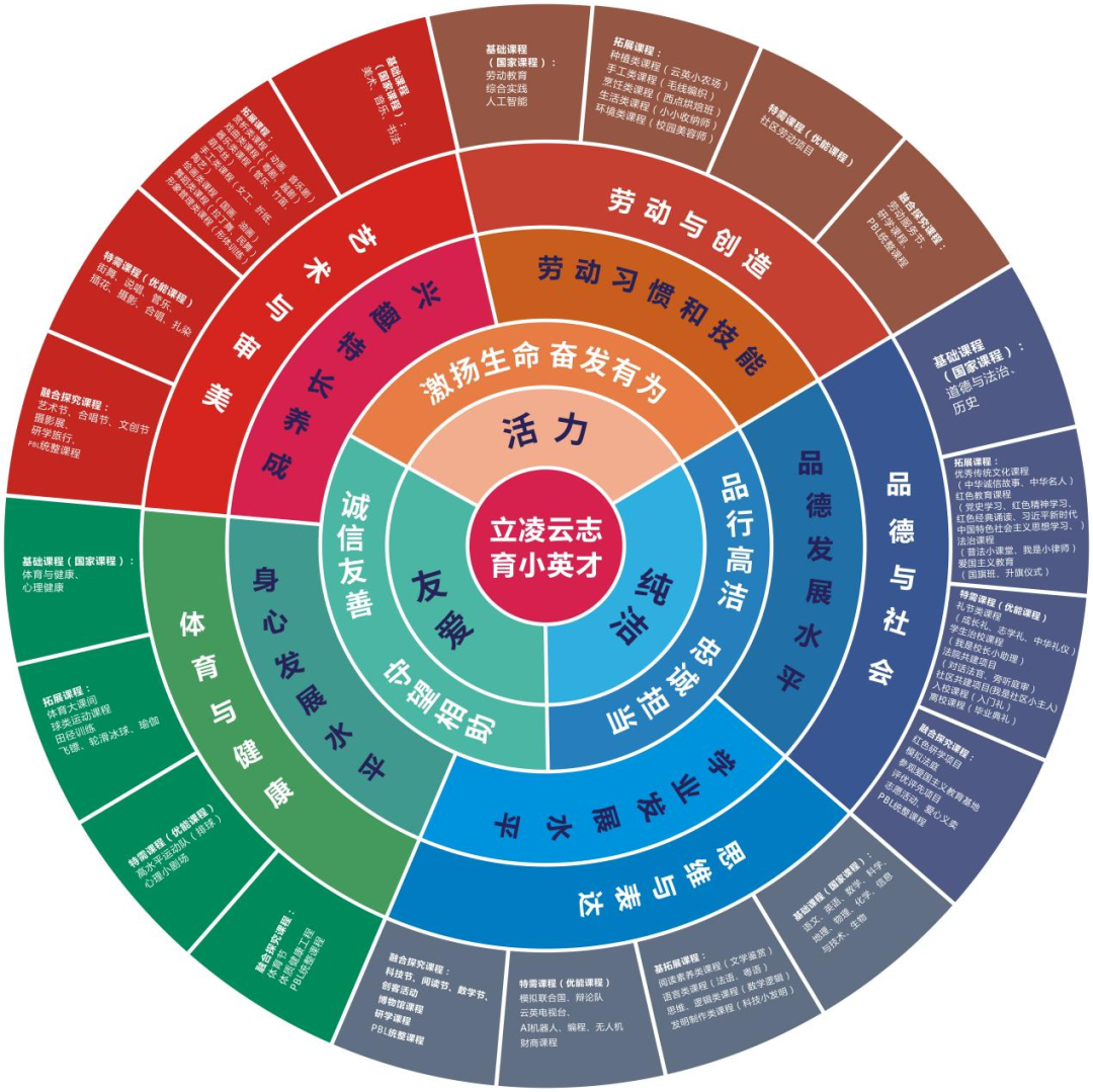 随着2020年中小学合并融合,云英实验学校以“小英才课程”为整体框架,创设纵向九年一贯、横向五育融合的“小英才”四维课程矩阵(基础固本课程、素养拓展课程、特需定制课程、融合探究课程),重点打造了“一体双翼·四维三基”的学段衔接课程(引桥课程),实现学生核心素养的螺旋式发展。