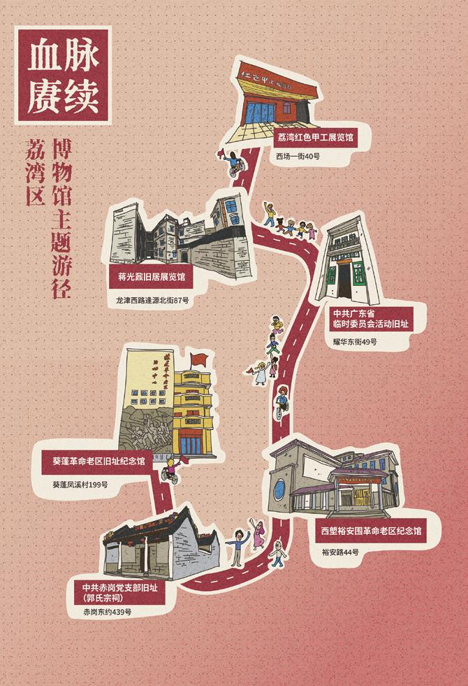 荔湾红色甲工展览馆——蒋光鼐旧居展览馆——中共广东省临时委员会活动旧址——西塱裕安围革命老区纪念馆——中共赤岗党支部旧址(郭氏宗祠)——葵蓬革命老区旧址纪念馆