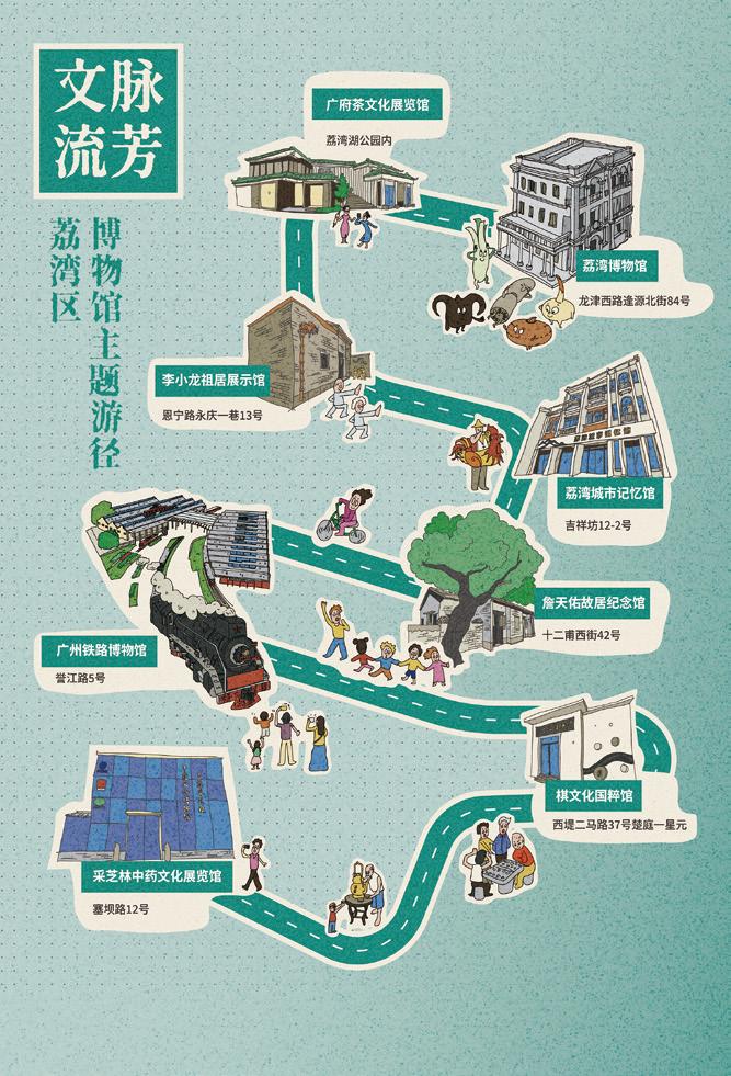 荔湾博物馆——广府茶文化展览馆——李小龙祖居展示馆——荔湾城市记忆馆——詹天佑故居纪念馆——广州铁路博物馆——棋文化国粹馆——采芝林中药文化展览馆。
