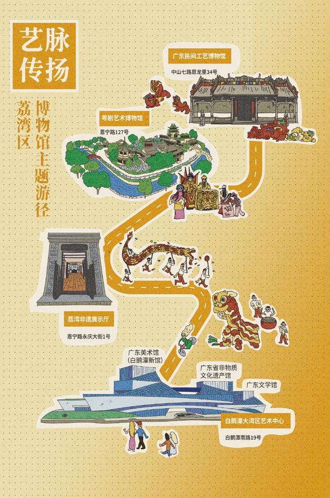 广东民间工艺博物馆——粤剧艺术博物馆——荔湾非遗展示厅——广东美术馆(白鹅潭新馆)——广东省非物质文化遗产馆——广东文学馆