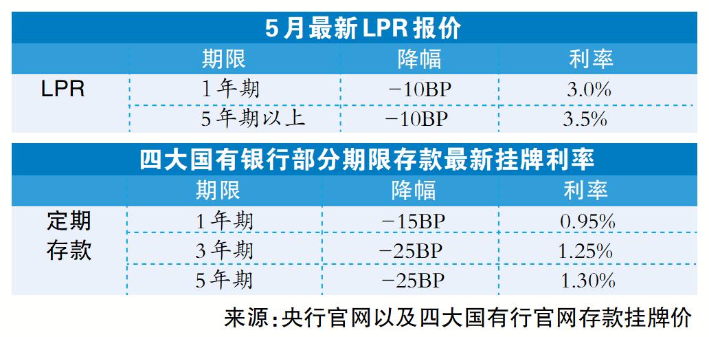 今年首轮存款和贷款降息,同时落地。5月20日一早,工农中建交及邮储等六大国有银行,以及招商银行、光大银行纷纷下调存款利率。其中,三年期和五年期存款下调幅度最大,达到25个基点,而一年期定存利率已全面跌至1%以下。这是全国性银行今年首轮存款降息。随后公布的5月LPR报价,也1年期LPR和5年期以上LPR分别下调10个基点,降至3%、3.5%。这是2025年首次降息,至此,LPR报价结束了此前的连续6个月“按兵不动”。