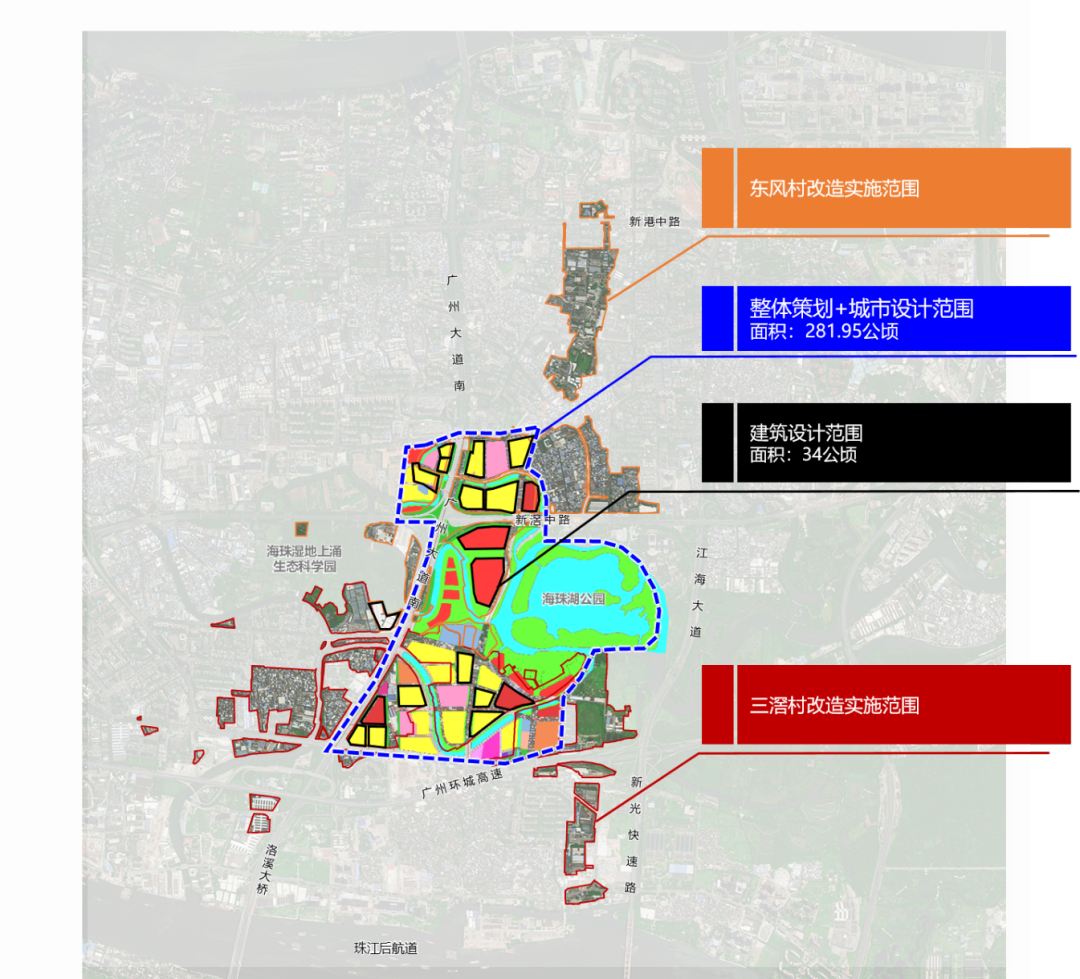 广州新中轴海珠片区改造,是落实广州三轴融合战略,强化世界级城市核心服务功能,提升中心城区魅力名片的重要抓手。本次竞赛范围“三滘村和东风村”位于新中轴海珠段中南部,地处中大国际创新生态谷核心区域,是体现城央生态价值的重要区域。现通过国际竞赛征集具有前瞻性与创新性的城市设计理念和符合广州新中轴海珠片区特色的城市设计方案及概念建筑设计方案,对广州新中轴海珠片区进行整体性研究,全面提升片区规划能级,进一步细化该片区规划建设要求,优化功能业态布局,服务片区开发建设及城市运营,实现将广州新中轴海珠段打造成为集时尚消费、生态文旅、科创总部于一体的世界级城市会客厅的目标。