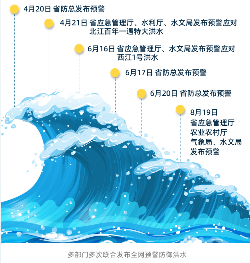 洪水多、早、强破纪录,多部门携手发布预警共筑防线。北江、西江、东江、韩江先后发生13次编号洪水,为我省有编号洪水统计以来最多次数,占全国的一半。2024年4月北江继2022年后再次发生百年一遇特大洪水,为全国大江大河有统计资料以来最早发生的特大洪水。韩江第4号洪水期间,韩江干流天然洪水超历史最高纪录。多部门联手发布全网预警防御极端洪水,水利部门汛期组织调度运用1017座(次)大中型水库,拦蓄洪水87亿立方米,避免了318个(次)城镇、60万亩耕地受淹,避免约129万人(次)转移。