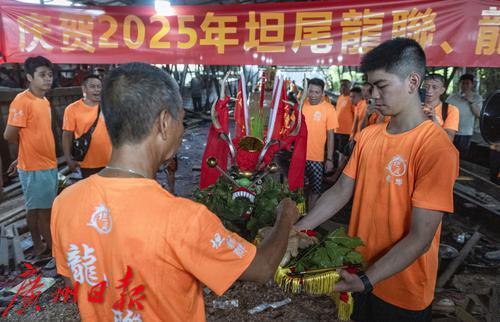 新龙船沿珠江被拖行至大坦沙岛后,村民在坦尾冮边公园举行接龙仪式。