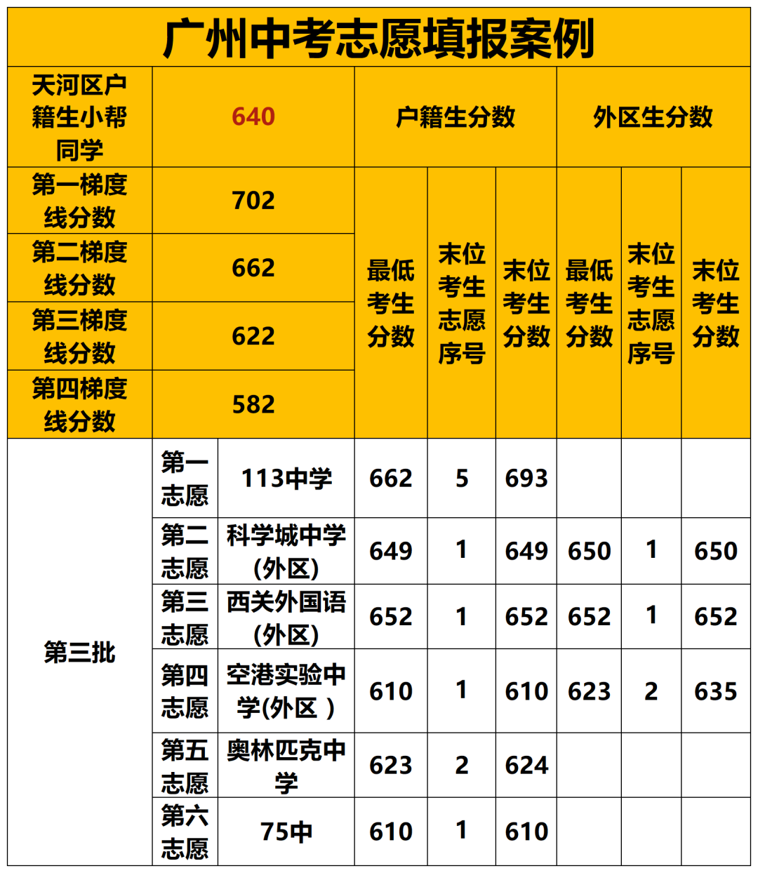 学生姓名:小帮,非广州市户籍生。升学区域:天河区。模拟填报背景:第一梯度线为702分,下面数据参考了2024年的录取分数,数据仅用于分析政策。