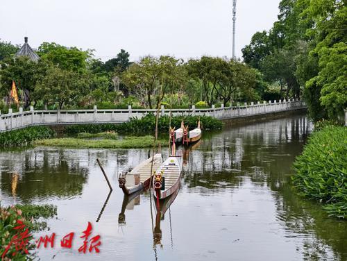 玉带河上停着几条龙舟。