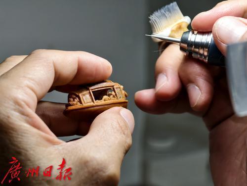 彭德平艺术工作室的匠人正在雕刻榄雕作品。