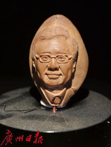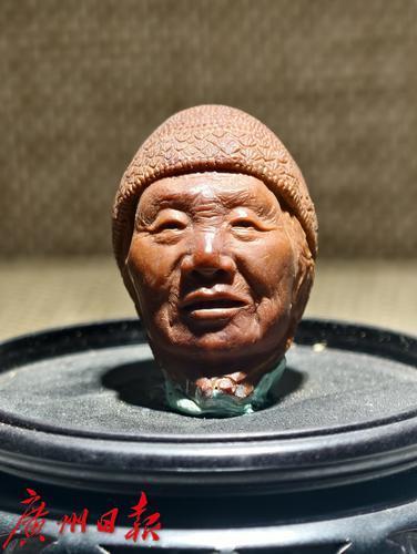 彭德平的榄雕作品,雕刻的是他奶奶的肖像,照片非常逼真。