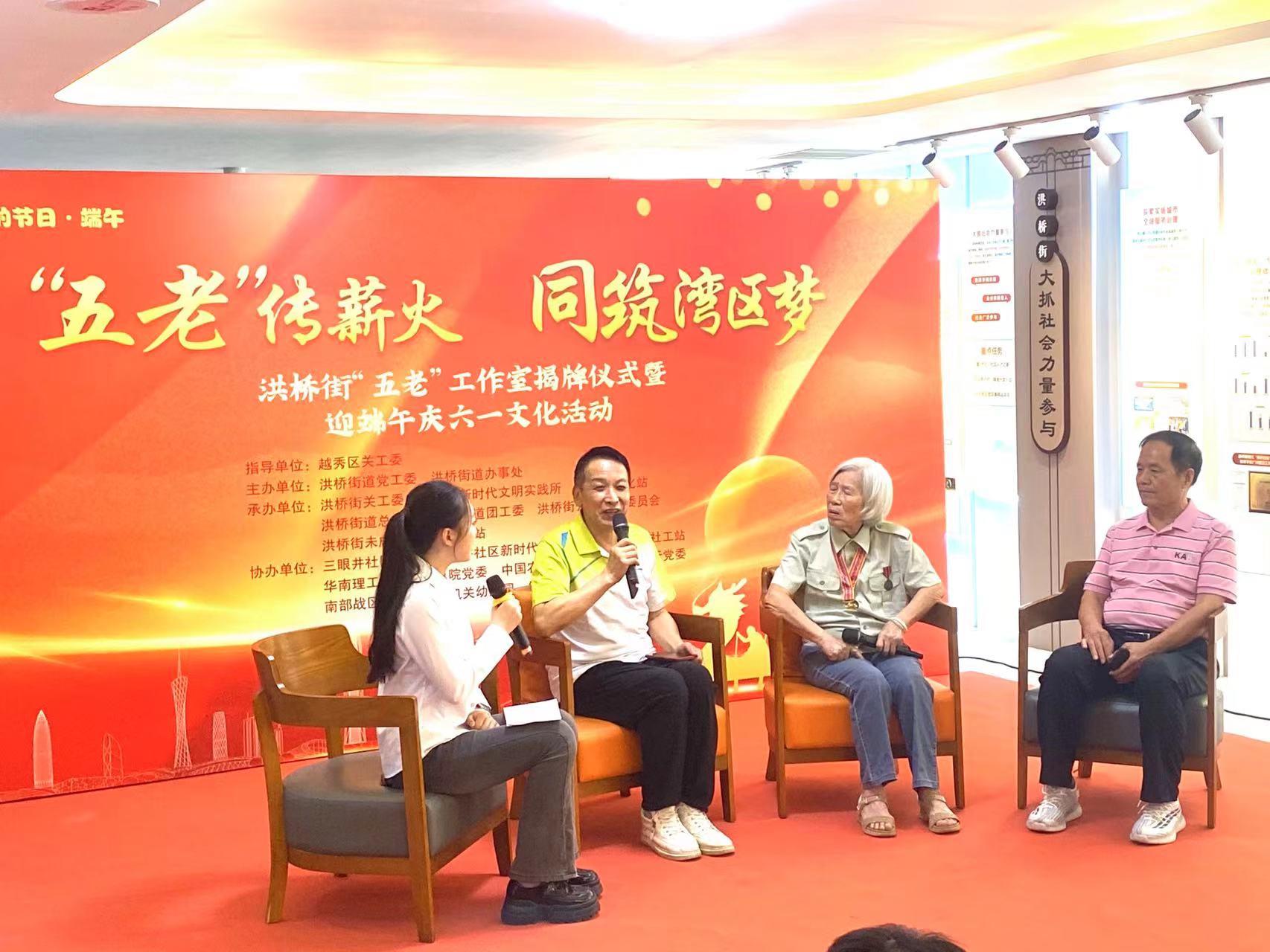 信息时报讯(记者 佘铄嘉)5月27日,由越秀区关工委指导,洪桥街道党工委、洪桥街道办事处主办,洪桥街关工委、洪桥街新时代文明实践所、洪桥街文化站、洪桥街道总工会、洪桥街公共卫生委员会承办的洪桥街“五老”工作室揭牌仪式暨迎端午庆六一文化活动如约而至。现场热闹非凡,充满温暖与欢乐。活动现场揭牌成立洪桥街“五老”工作室,举办青年对话“五老”座谈会,首发“黉课堂”视频,并开展爱心捐赠、品味端午等环节。