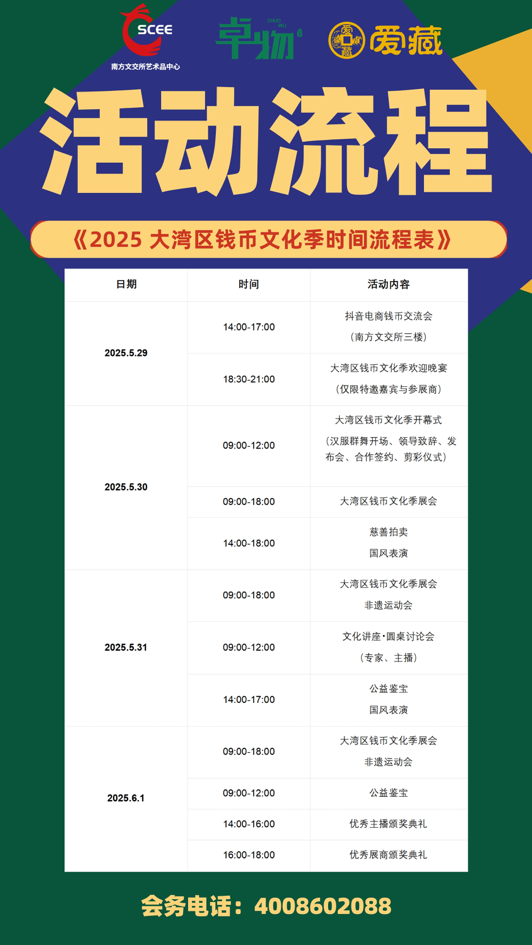 据悉,2025大湾区钱币文化季以钱币文化为切入点,融合非遗、国潮、数字技术等元素,既是文化传承的创新实践,也是湾区文旅融合的示范案例。活动由广州市黄埔区文化广电旅游局、国家对外文化贸易基地(广州)、广州市黄埔区萝岗街道办事处以及广州市黄埔区云埔街道办事处提供特别支持;广东省文物行业协会、金融博物馆联盟、广东省集币协会担任指导单位;联合抖音电商、快手电商、中关村意谷(广州)数字科技有限公司、广州市黄埔区卓物钱币博物馆、广州市黄埔区卓物天工修复博物馆、广东省二十一世纪教育基金会、广州市纵原邮币卡收藏品市场、广州市白云区汉服文化协会等数字平台、文教、企业机构共同呈现。政企协作、跨界联动,打造集学术研讨、金融展览、公众体验于一体的文化盛宴,助力人文湾区建设。