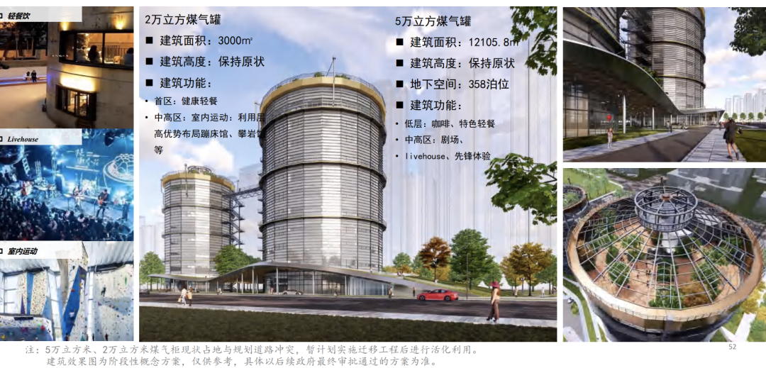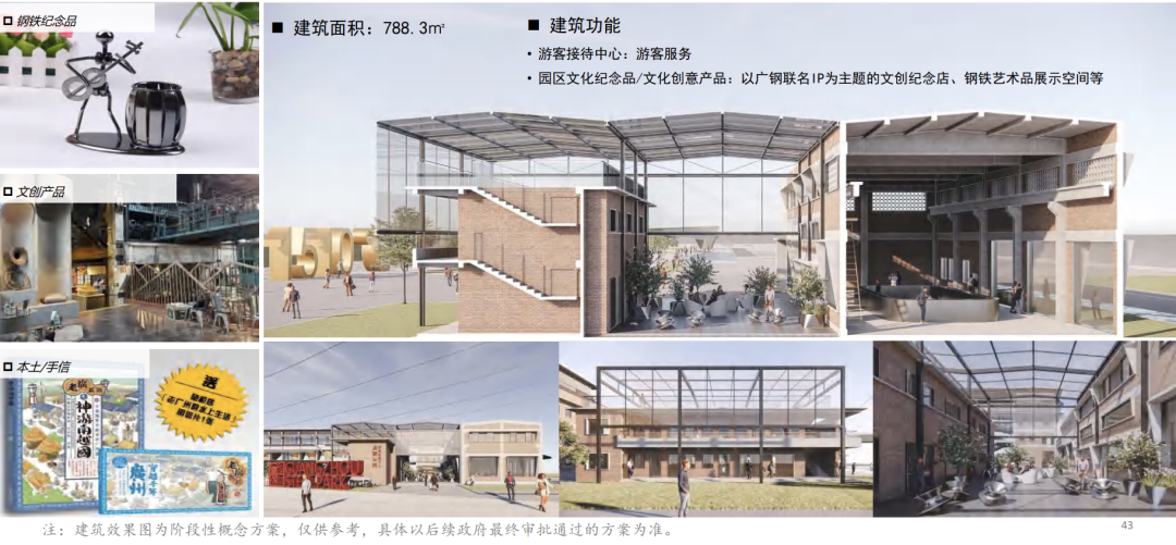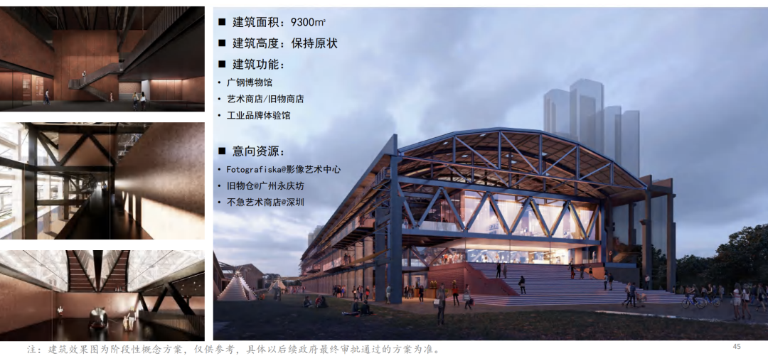 如,中和料场机加工间拟将改造为游客接待中心,进行园区文化纪念品/文化创意产品展售,保留工业遗存特色,在公园中承担重要的对外门户的作用。热电厂干煤棚拟将打造广钢博物馆。AF040216地块废钢堆场则拟作为工人文化宫,在工业遗存里重塑工业文化精神,为工人提供多元、趣味、具有工业文化特色的活动中心。出铁场除尘风机房拟将打造为复合文化体验馆,利用倒锥形舱体空间改造为咖啡厅,配合灯光设计,成为市民公共休憩消闲的场所。高炉组团拟将变身国际艺术展览馆。5万立方米煤气罐、2万立方米煤气罐计划引入演出场所+运动健身+轻餐饮,遵循煤气罐的原始风貌,内部打造有层次感的中庭空间,为市民提供一个具有戏剧性的游玩场所。3万立方米煤气罐拟将引入美术馆+艺术家工作室,建设国际级美术馆。此外,AF040420地块拟建设社区服务中心(新建建筑),为周围居民提供配套的高质量社区服务。