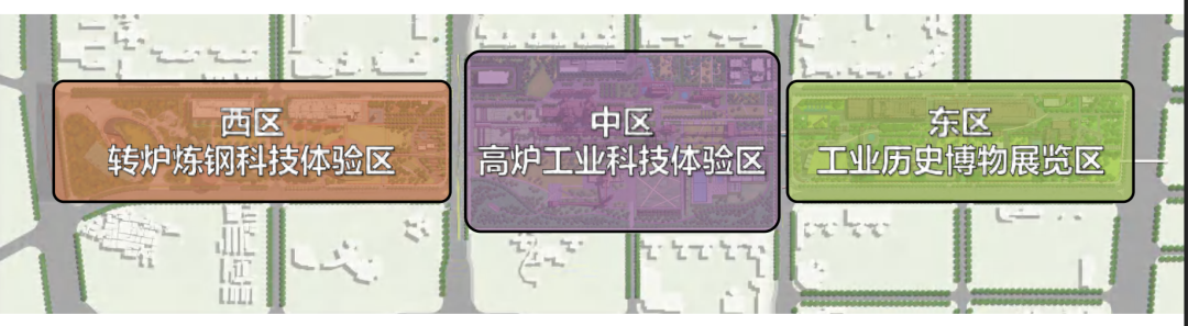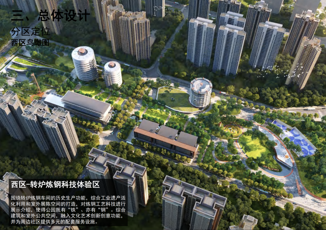 西区-转炉炼钢科技体验区:西区围绕转炉炼钢车间的历史生产功能,综合工业遗产活化利用和室外展陈空间的打造,对炼钢工艺科技进行展示介绍,使得公园既有“铁”、亦有“钢”。综合建筑和室外公共空间,融入文化艺术创新创意功能,并为周边社区提供多元的配套服务设施。