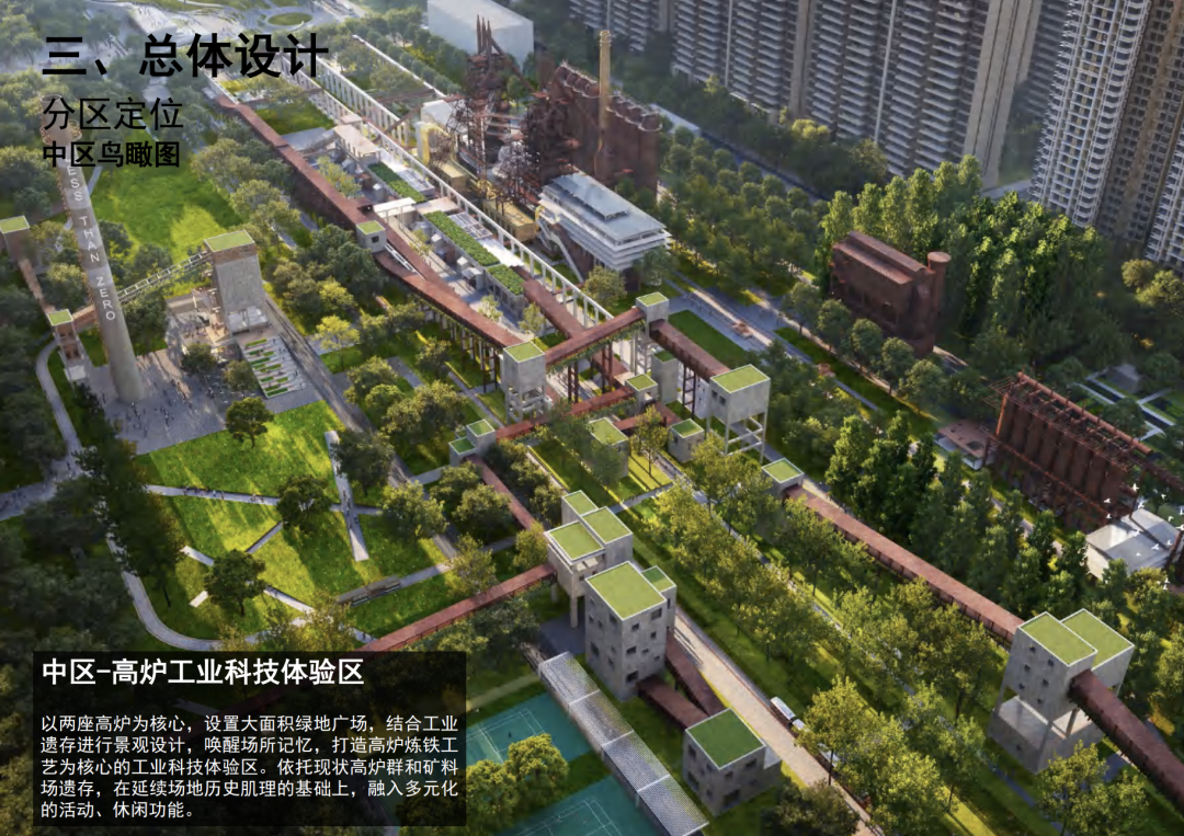 中区-高炉工业科技体验区:中区以两座高炉为核心,设置大面积绿地广场,结合工业遗存进行景观设计,唤醒场所记忆,打造高炉炼铁工艺为核心的工业科技体验区。依托现状高炉群和矿料场遗存,在延续场地历史肌理的基础上,融入多元化的活动、休闲功能。
