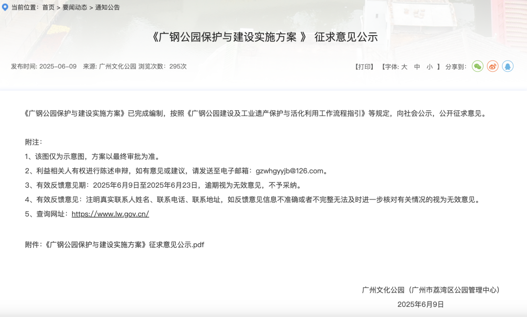 2025年6月9日,广州文化公园(广州市荔湾区公园管理中心)就《广钢公园保护与建设实施方案》公开征求意见。据悉,《广钢公园保护与建设实施方案》(下称“实施方案”)已完成编制,按照《广钢公园建设及工业遗产保护与活化利用工作流程指引》等规定,向社会公示。