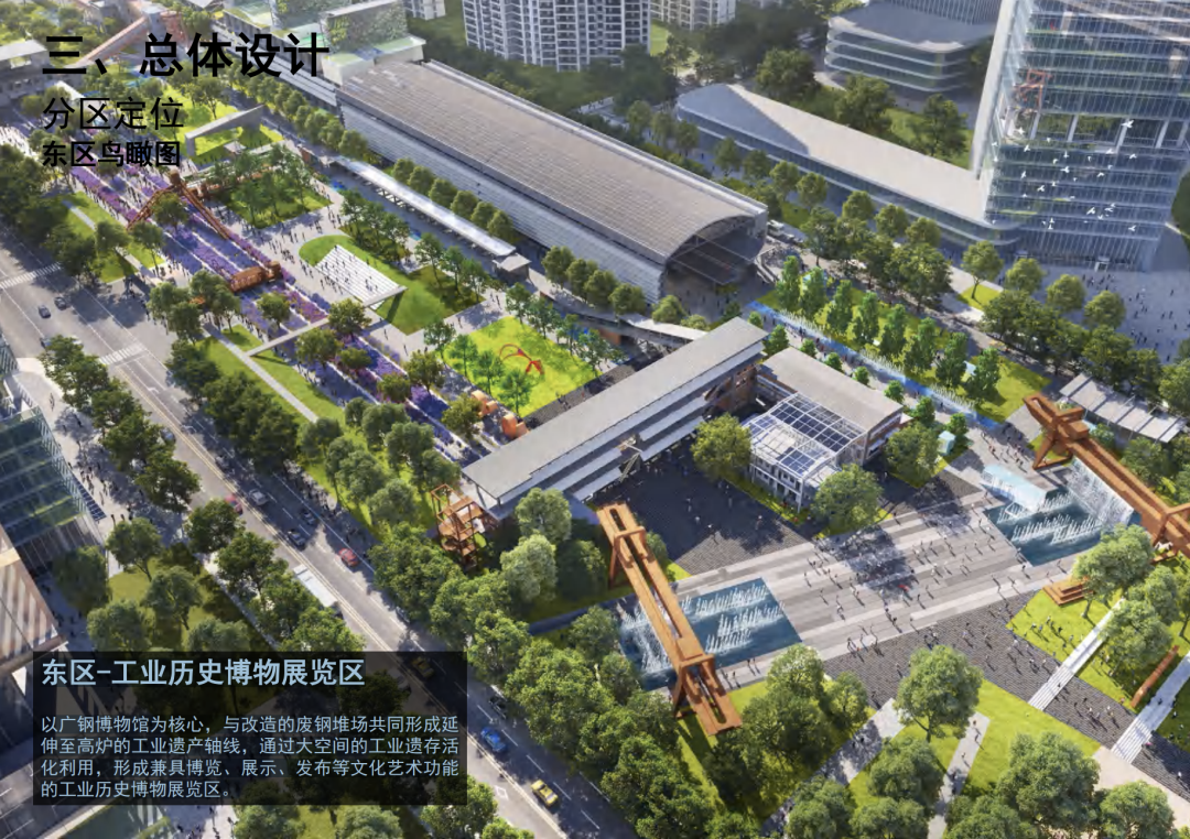 东区-工业历史博物展览区:东区以广钢博物馆为核心,与改造的废钢堆场共同形成延伸至高炉的工业遗产轴线,通过大空间的工业遗存活化利用,形成兼具博览、展示、发布等文化艺术功能的工业历史博物展览区。