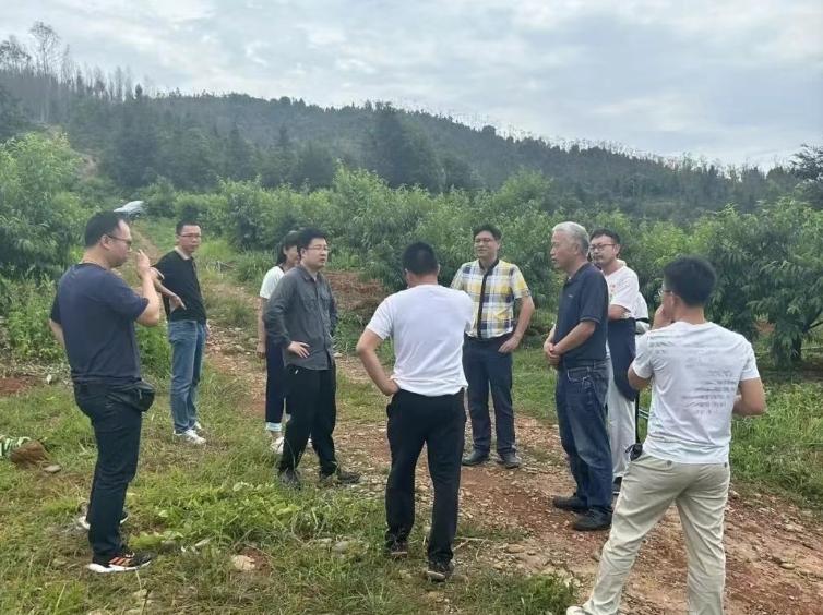 专家调研组在河源市鹰嘴蜜桃主要产区的果园与农户展开实地交流。