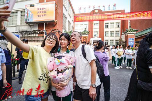 十七中考点门口,家长给走出考场的考生送上鲜花、玩偶,并合影留念。