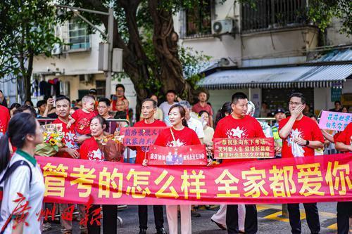 在现场,记者还看到了一家人,男女老少一共出动了14人,举着牌子、拉着“不管考得怎么样,全家都爱你”的横幅来迎接考生。