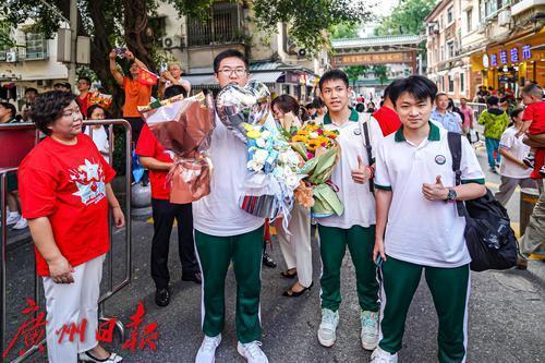在校门外,早已是等候多时的家长,家长们给考生递上鲜花,祝贺孩子们顺利完成高考。学校老师还组织考完的考生在校门口一起合影留念,现场氛围欢快,午后的高温也难抵青春的无限热情。