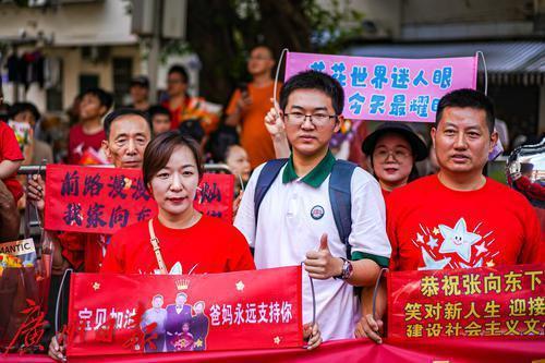 张向东的家人们穿红衣、拿鲜花、举牌子,等待他走出考场。
