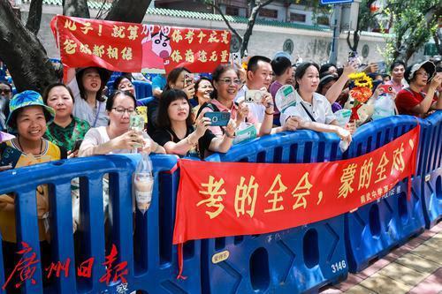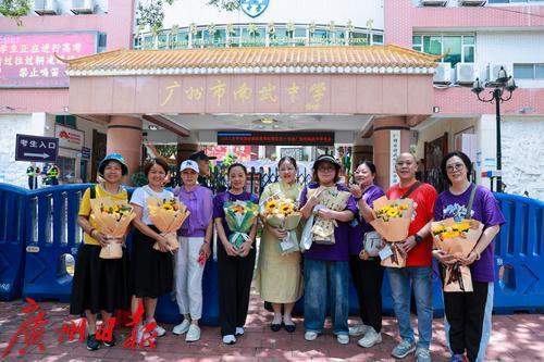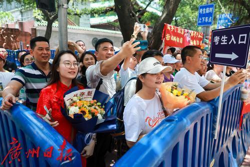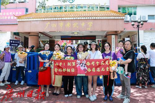 南武中学考场外,家长们早早守候,他们手捧鲜花、举着横幅迎接考生步出考场,场面既热闹又温馨。
