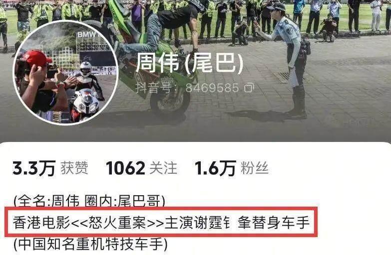 在周伟的社交账号简介上,显示他是电影《怒火重案》主演谢霆锋的替身车手,也是知名重机特技车手,其账号里都是有关骑摩托车的视频。在圈内被称之为“尾巴哥”。