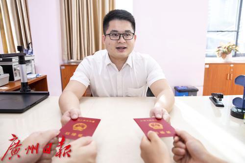 去年年底,南沙区民政局婚姻登记处婚姻颁证员乐愚在广东省婚姻登记员和婚姻颁证员技能比赛决赛中获得个人一等奖。而被大家视为广东“最厉害的颁证员”之一的他,在意的不仅仅是荣誉——从2019年开始到现在,他已经为超过5000对新人举行颁证仪式,见过新人在仪式中喜极而泣,也遇到过带着孩子重温仪式的家庭。在乐愚看来,家是最小国,国是千万家。颁证仪式的意义,是让每一对新人带着这座城市的祝福和见证书写接下来的幸福人生。