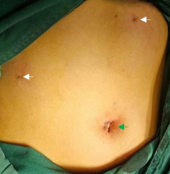 白色箭头:1.9毫米超微针孔切口;绿色箭头:肚脐单孔切口。