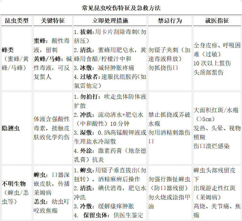 除了蛇类咬伤,昆虫咬伤也是夏季常见的威胁。昆虫咬伤的特点主要由其毒性机制决定。包括毒液成分,如蜂类的碱性毒素、蜘蛛的神经毒素;唾液致敏物,如蚊虫的异种蛋白;机械损伤,如蜱虫口器残留,来共同引发局部或全身反应。