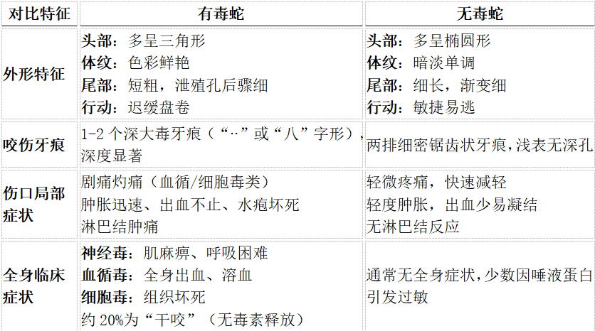 我们可以通过外形特点及咬伤后症状来区别有毒蛇与非毒蛇: