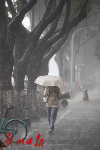 受台风蝴蝶环流影响,本周末广州将有大到暴雨局部大暴雨,陆地阵风可达6~9级。需注意防御强降水及其引发的山洪、泥石流、山体滑坡和中小河流域洪水等次生灾害。 图片摄于2025年6月13日,广州市海珠区街头风雨大作。