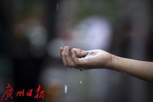 一位小朋友用屋檐上滴下来的雨水洗去手上的污渍。