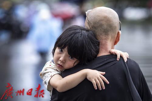 小雨中,一位小女孩在大人的怀里冒雨过马路。
