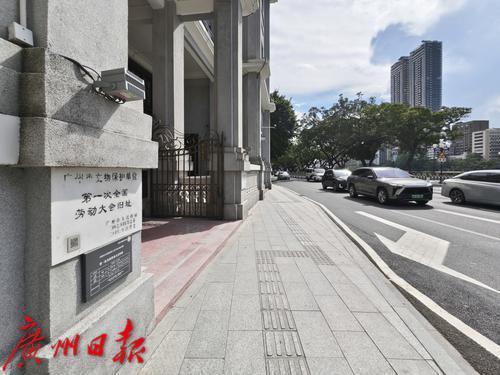 位于珠江南岸、滨江中路段的第一次全国劳动大会旧址在本轮提升工程中,通过调整车道宽度(由3.5米减至3米),在保障交通安全的前提下成功 “让出”约1米人行通道空间。改造后,人行道得以完整贯通,显著提升通行连续性与安全性。